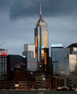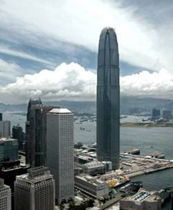 | 6. Міжнародний фінансовий центр, Китай (Two International Finance Centre – 415 м, 88 поверхів, 2003 рік) Найвища споруда у Гонконгу, спроектована Сезаром Пеллі (Cesar Pelli). Горішні поверхи займає Фінансове управління Гонконга. 22 поверхи – торгові, хоча вежу створено для фінансових установ. У будівлі встановлені двоярусні ліфти. |