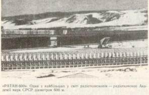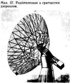 2. Радіотелескопи. Після того як було виявлено космічне радіовипромінювання, для його приймання створили радіотелескопи різних систем. Антени деяких радіотелескопів схожі на звичайні рефлектори. Вони збирають радіохвилі у фокусі металевого вгнутого дзеркала, яке можна зробити ґратчастим і величезних розмірів — діаметром у десятки метрів.