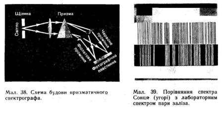 Для одержання спектрів застосовують прилади, які називаються спектроскопом і спектрографом (мал. 38). У спектроскоп спектр розглядають, а спектрографом його фотографують. Фото-, графія спектра називається спектрограмою.