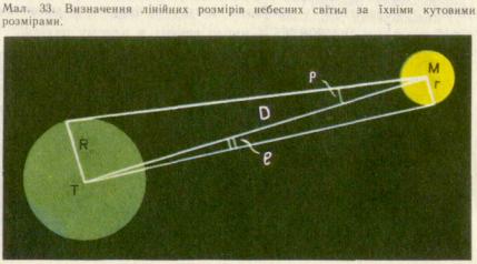 4. Визначення розмірів світил. На малюнку 33 Т — центр Землі, М — центр світила лінійного радіуса r. За визначенням горизонтального паралакса радіус Землі R видно із світила під кутом р, а радіус світила r видно із Землі під кутом g. Оскільки