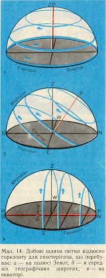 2. Добовий рух світил на різних широтах. Тепер нам відомо, що із зміною географічної широти місця спостереження змінюється орієнтація осі обертання небесної сфери відносно горизонту. Розглянемо, якими будуть видимі переміщення небесних світил у районі Північного полюса, на екваторі й на середніх широтах Землі.