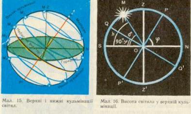 3. Висота світил у кульмінації. Полюс світу при позірному обертанні неба, що відображає обертання Землі навколо осі, займає незмінне положення над горизонтом на даній широті (див. мал. 12). Зорі за добу описують над горизонтом навколо осі світу кола, паралельні небесному екватору. При цьому кожне світило за добу двічі перетинає небесний меридіан (мал. 15).