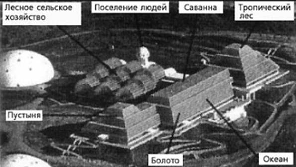 У спорудженні «Біосфери-2» — ініціатором цього широкомасштабного експерименту став колектив Колумбійського університету (штат Нью-Йорк), а виконавцем стала американська фірма «Space Biospheres Ventures» (спочатку проект фінансував техаський мультимільйонер Е.Басс, що виділив 30 мільйонів доларів) — брали участь інженери, архітектори, біологи, гідробіологи, ботаніки, бактеріологи і представники ще дуже багатьох наук і професій. На площі в 9 тисяч квадратних метрів (біля гектара) під скляними ковпаками (а «дно» було ізольовано від землі герметично звареними сталевими аркушами) була зведена зменшена копія Землі. У 5-6поверхових «будинках» зі скла і сталі розмістилися сім екологічних систем у мініатюрі: вологий тропічний ліс, савана, болото, солоне море, пустеля. Крім того, там були басейни для риб, інсектаріум з 250 видами комах, сільськогосподарська ферма (тут повинні були жити приблизно 4 тисячі видів рослин і тварин) і житлова частина — кімнати для співробітників, майстерні, інформаційно-обчислювальний центр для контролю за всіма процесами. Кожна сфера, кожна з цих екологічних ніш була відділена від інших і мала свій особливий клімат.