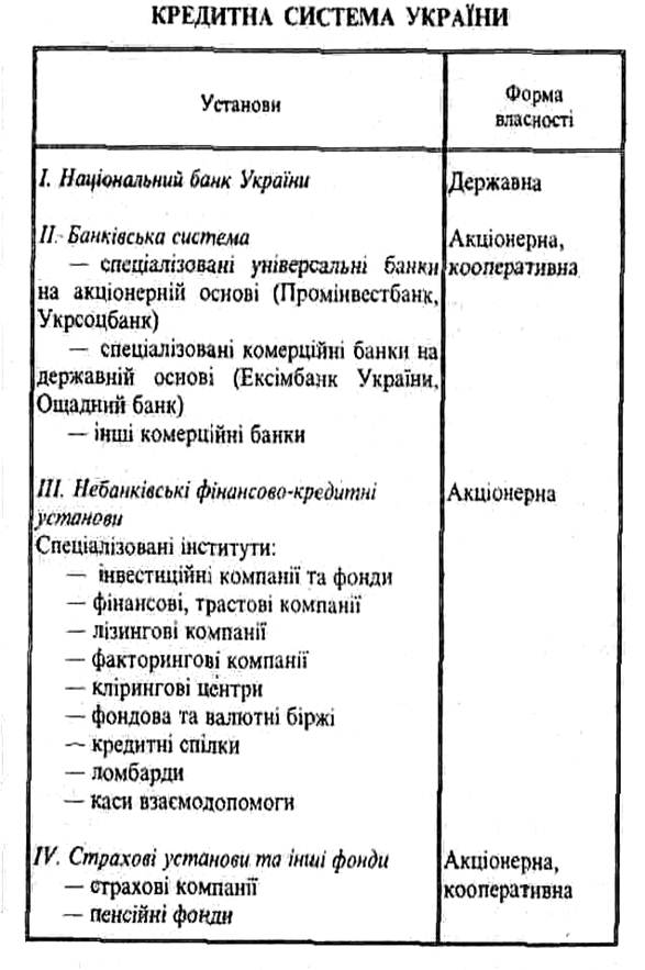 Кредитну систему України очолює Національний банк України, який здійснює систему заходів у кредитній сфері з метою регулювання грошового обігу. До кредитної системи України належать також комерційні банки та небанківські кредитно-фінансові установи, які повинні мати ліцензію Національного банку України для здійснення кредитування,