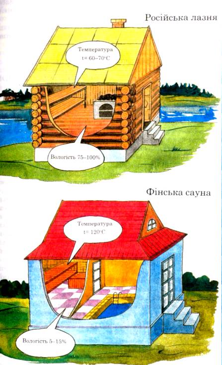 В Україні поширені, як звичайно, два типи лазень – російська й фінська (сауна). Різняться ці лазні режимом температури й вологості. Російська лазня – це парова лазня з температурою 60–70° і вологістю 75–100%. Сауна – це суха лазня з температурою до 120° і вологістю 5–15% (мал. 1). І в тій, і в іншій лазнях користуються віниками (своєрідний масаж), розпарившись, занурюються в холодну воду чи сніговий замет. У російської та фінської лазень є «родичі» – японське офуро, турецький хамам, римські терми та інші.