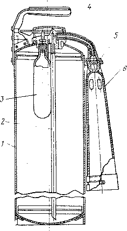 1- корпус; 2- стакан с кислотной частью заряда; 3-ручка; 4- рукоятка; 5- шток; 6- крышка; 7- спрыск; 8- клапан.