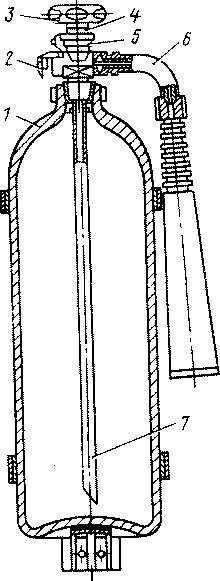 1- балон; 2- запобіжник; 3- маховичок вентиля-замок; 4- металева пломба; 5- вентиль; 6- поворотний механізм з розтрубом; 7- сифонова трубка.