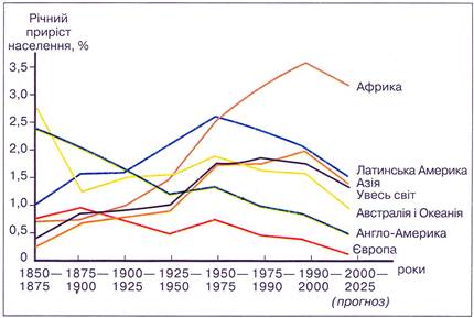 Ще наприкінці XVIII ст. священик Мальтус виклав теорію, згідно з якою населення Землі зростає швидше, ніж виробництво продовольства, з усіма зловісними наслідками, що з цього випливають. На щастя, життя останніх двох століть не підтвердило цієї теорії: виробництво продовольства, не кажучи вже про виробництво взагалі, зростало швидше, ніж збільшувалося населення. Протягом XX ст. в економічно розвинутих країнах природний приріст був досить низький, а «демографічний вибух» першої половини XX ст. у більшості регіонів вже пішов на спад (мал. 1). Основними чинниками, що стримали темпи зростання населення світу, стали процеси індустріалізації та урбанізації, які поступово охопили всі регіони планети. В цілому, оцінюючи ситуацію, необхідно зважити на такі особливості.