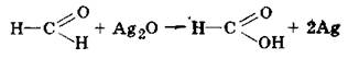 Реакції окиснення відбуваються дуже легко за місцем зв'язку С—Н, який перебуває під впливом карбонільного атома кисню. Так, при нагріванні формальдегіду з аміачним розчином оксиду срібла Ag2O (у воді оксид срібла не розчиняється) відбувається окиснення формальдегіду у мурашину кислоту НСООН і відновлення срібла: