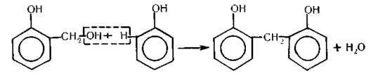 Добутий продукт взаємодіє з наступною молекулою формальдегіду, потім з молекулою фенолу і т.д. Такий спосіб добування полімеру називається реакцією поліконденсації.