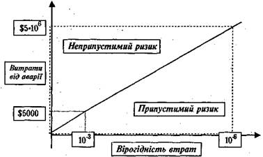 Рис. 3, запозичений з довідника «Менеджмент ризику», графічно ілюструє модель індексу витрат, що очікуються, яка базується на вартості витрат, у системі порівняно з вірогідністю цих витрат. Прийнятна вартість небезпечної ситуації визначена індексом п'ять (насправді можна використовувати будь-який індекс, це призведе лише до зміни нахилу лінії). Приклад на цьому малюнку має відношення тільки до матеріальних втрат. Можлива шкода персоналу (смерть, травми, захворювання) в даному прикладі не розглядається. В разі шкоди персоналу значення втрат у системі та пов'язані з цим витрати повинні бути переглянуті через важливість збереження людського життя.