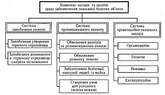 Забезпечення пожежної безпеки об'єкта досить складне і багатоаспектне завдання, тому до його вирішення необхідно підходити комплексно. Комплекс заходів та засобів щодо забезпечення пожежної безпеки об'єкта складається із відповідних систем, кожна з яких підрозділяється на підсистеми, а ті, в свою чергу, на підсистеми нижчого рівня, які на рис. 1 не показані.