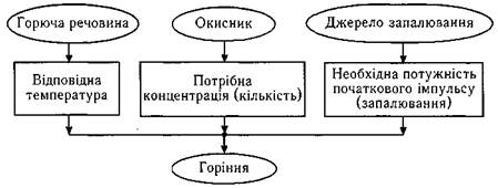 На рис. 2. наведено графічне зображення умов, необхідних для виникнення горіння. Якщо хоча б одна з цих умов не виконується, то горіння не виникає.