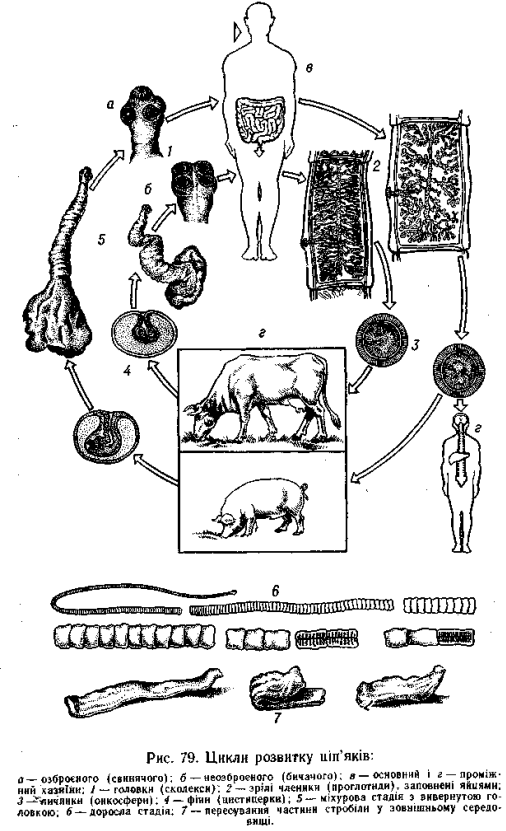 Ціп'як бичачий (неозброєний; рис. 79). Дорослий паразит у стьожковій стадії живе в тонкій кишці людини, а личинки його живуть в різних органах великої рогатої худоби. Хазяїна, в тілі якого розвиваються личинкові стадії, прийнято називати проміжним, з в тілі якого паразит досягає статевої зрілості — остаточним. Отже, для ціп'яка неозброєного проміжний хазяїн — велика рогата худоба, а основний — людина.