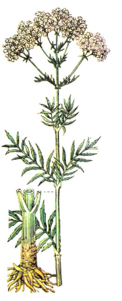 Кореневище валеріани містить ефірну валеріанову олію (1—3%), дубильні речовини, смоли і алкалоїди (валсрнн і хатинін), крохмаль, цукор, кислоти (яблучну, мурашину, оцтову і валеріанову). Ефірна олія валеріани складається з борнеолу та валеріанової кислоти і діє па організм заспокійливо, зніжуючи збудливість центральної нервової системи.