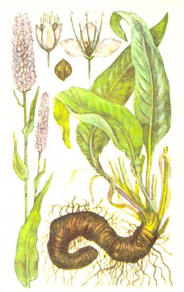 Як виглядає? Багаторічна, трав'яниста рослина, ЗО—100 см заввишки. Стебло її просте, з небагатьма лінійними сидячими листками. Суцвіття поодинокі, на довгому безлистовому квітконосі, густі, колосоподібні, довгасті, циліндричні, квітки рожеві або білі. Кореневище його товсте, трохи сплюснуте, подібне до ракових шийок, зігнуте у вигляді змії, зовні коричневе, всередині рожеве. Цвіте у травні — липні.