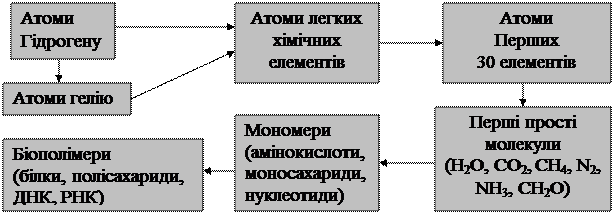 1-й етап. Формування вуглеводних сполук та їхніх похідних: атоми Карбону з'єднувалися між собою та утворювали ланцюги різної довжини. Це початкові ланки в еволюційній низці більш складних органічних сполук, до якої входять жири, прості вуглеводи та амінокислоти. Найпростіший представник вуглеводнів — метан. Первинна літосфера, гідросфера та атмосфера були буквально насичені вуглеводнями. Умови, які існували на Землі в той час: сильні теплові та радіоактивні процеси, ультрафіолетові випромінювання та інші,— сприяли їх ускладненню.