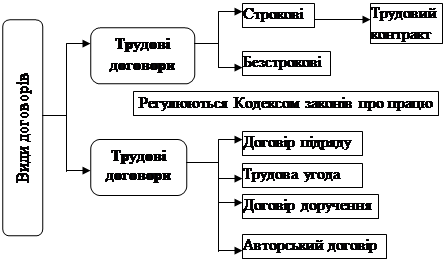 Трудові відносини на підприємстві між власником (роботодавцем) і працівником регулюються, крім нормативних і законодавчих актів, ще й за допомогою трудових договорів і угод, види яких наведено нижче (див. рис. 1.1).