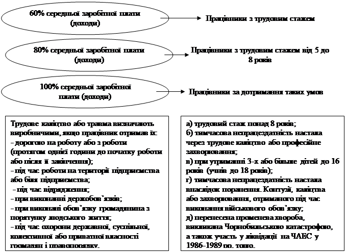 Допомога у зв'язку з тимчасовою непрацездатністю обчислюється, виходячи із загального стажу роботи працівника в розмірах, які визначаються залежно від загального трудового стажу працівника (рис. 1.3).