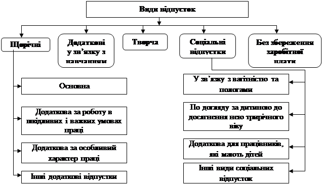 Законом України "Про відпустки" встановлено такі види відпусток (див. рис. 1.5).