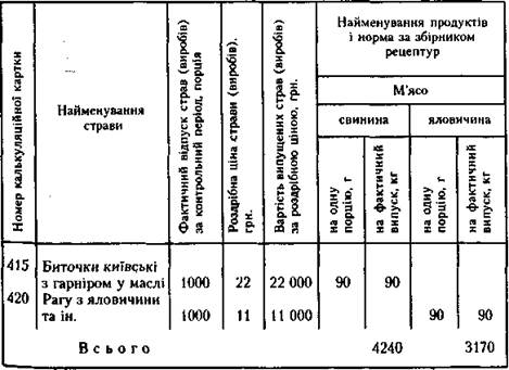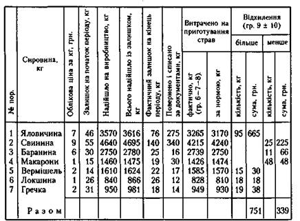 період (табл. 5.4). Це дає змогу встановити за найменуванням витрати сировини згідно з нормами рецептур, відображених у калькуляції вартості страв. Потім на підставі звітін завідуючих виробництвом і первинних документів про переміщення сировини, а також її списання на виготовлення страв і кулінарних виробів способом оберненого калькулювання складають контрольну відомість фактичного використання сировини порівняно з нормами (табл. 5.5). Це дає змогу встановити недовкладення сировини у вироби або нееквівалентну заміну сировинного набору у корисливих цілях.