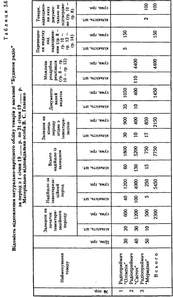 Розглянемо відновлення натурально-вартісного обліку товарів у магазині "Будинок радіо" за ревізійний період (табл. 5.6).