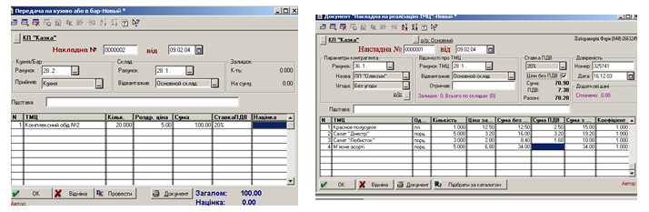 Рис.5.6. Документи “Накладна на внутрішнє переміщення” (зліва) та “Накладна на реалізацію” (справа).