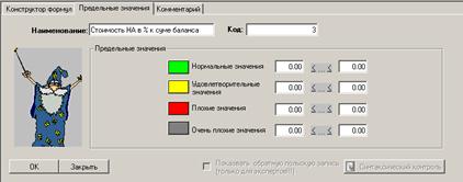 Програма “Форт: Аналітик” передбачає введення граничних значень для кожного показника, що дозволяє не лише побачити розраховане значення, але й оцінити ступінь його наближення до граничного або нормального значення (рис.5.14.), виділивши чотири основних граничних значення: