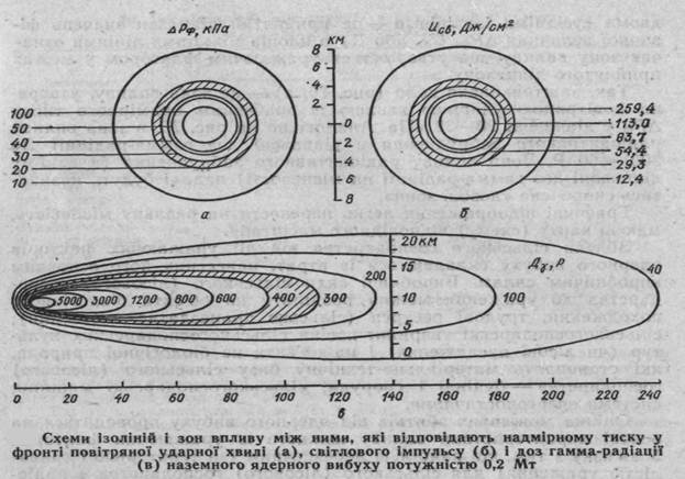 Рис. 7.1. Схеми ізоліній і зон впливу між ними, які відповідають надмірному тиску а) у фронті повітряної ударної хвилі; б) світлового імпульсу; в) доз гама радіації наземного ядерного вибуху потужністю 0,2 Мт