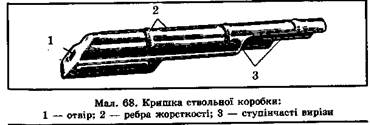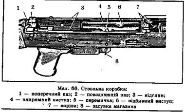 Ствольна коробка (мал. 66) з'єднує частини і механізми автомата, забезпечує закривання каналу ствола затвором і запирання затвора. У ствольній коробці розташований ударно-спусковий механізм. Зверху коробка закривається кришкою.