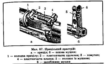 Прицільний пристрій (мал. ) необхідний для наведення автомата при стрільбі по цілях на різні відстані. Мушка загвинчена в полозок, який кріпиться в основі мушки.