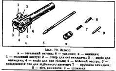 Затвор (мал. ) служить для досилання патрона у патронник, закривання каналу ствола, розбивання капсуля і викидання з патронника гільзи патрона.