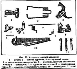 Ударно-спусковий механізм (мал. ) призначений для спуску курка з бойового зводу або із зводу автоспуску, нанесення удару по ударнику, забезпечення ведення автоматичного чи одиничного вогню, припинення