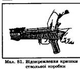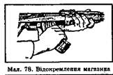 1. Відокремити магазин (мал. ). Утримуючи автомат за шийку приклада чи цівку, правою рукою охопити магазин, великим пальцем натиснути на засувку, подати нижню частину магазина вперед і відокремити його. Після цього перевірити, чи не залишився патрон у патроннику, для чого перевести перевідник донизу, відвести рукоятку затворної рами назад, оглянути патронник, відпустити рукоятку затворної рами і спустити курок з бойового зводу.