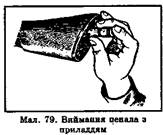 2. Вийняти пенал з приладдям (мал. ). Притиснути пальцем правої руки кришку гнізда приклада так, щоб пенал під дією пружини вийшов з гнізда; розкрити пенал і вийняти з нього протирку, йоржик, викрутку, вибивач і шпильку. Якщо автомат зі складаним прикладом, то пенал знаходиться в кишені сумки для магазинів.