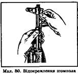 3. Відокремити шомпол (мал. ). Відтягнути кінець шомпола так, щоб його головка вийшла з-під упора на основі мушки, і витягти шомпол догори.