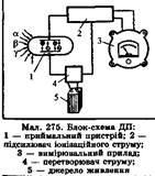 Прилади, призначені для виявлення і вимірювання радіоактивних випромінювань, називаються дозиметричними (мал. ). їх основними елементами є приймальний пристрій (1), підсилювач іонізаційного струму (2), вимірювальний прилад (3), перетворювач струму (4), джерело живлення (5).
