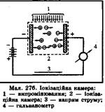 ударної іонізації (мал. ). Іонізуючі випромінювання, потрапивши у лічильник, утворюють у ньому первинні електрони і позитивні іони; електрони під дією електричного поля переміщуються до анода лічильника і, здобувши кінетичну енергію, самі вибивають електрони з атомів газового середовища. Це явище й називається ударною іонізацією. Вибиті вторинні електрони також розганяються і разом з первинними підсилюють ударну іонізацію. Якщо у лічильник потрапляє хоча б одна частка іонізуючого випромінювання, це викликає утворення лавини вільних електронів, і до анода лічильника прямує багато електронів. Інертні гази створюють у корпусі газорозрядного лічильника умови для виникнення ударної іонізації, розряджання забезпечує швидке набування електронами необхідної кінетичної енергії.
