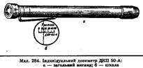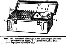 Дозиметр ДКП-50А (мал. 284) забезпечує вимірювання індивідуальних доз гамма-випромінювання в діапазоні від 2 до 50 Р при потужності експозиційної дози від 0,5 до 200 Р/год. Похибка вимірювання становить ±10 %. Принцип дії подібний до принципу дії електроскопа. Основна частина дозиметра — малогабаритна іонізаційна камера з «повітроеквівалентними» стінками, до яких підключено конденсатор з електроскопом. Під впливом гамма-випромінювання у робочому відділенні камери виникає іонізаційний струм, що зменшує потенціал конденсатора і камери. Зменшення потенціалу пропорційне експозиційній дозі опромінення. Відхилення рухомої системи електроскопа — платинової нитки — вимірюється відрахунковим мікроскопом зі шкалою, від-градуйованою у рентгенах.