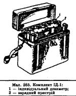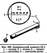 Комплект індивідуальних дозиметрів Щ-1 (мал.) служить для вимірювання поглинених доз гамма-нейтронного випромінювання у межах від 2 до 500 рад при потужності дози від 10 до 360 000 рад/год. Ціна поділки н$ шкалі дозиметра — 20 рад (мал.). Дозиметр перезаряджається від зарядного пристрою ЗД-6.