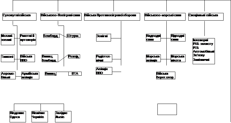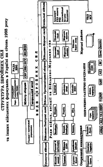 Збройні Сили України є основою військової організації держави. Державною програмою будівництва та розвитку Збройних Сил України передбачено мати у їхньому складі чотири види Збройних Сил: Сухопутні війська, Військово-Повітряні сили, Війська Протиповітряної оборони, Військово-Морські сили; спеціальні війська; Залізничні війська, а також органи управління і тилу, з'єднання, частини, військово-навчальні заклади, установи, підприємства, які не входять до видів Збройних Сил.