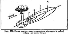 Впливу радіоактивного зараження може зазнавати не тільки район, що прилягає до місця вибуху, а й місцевість, віддалена на десятки і сотні кілометрів. При цьому на великих площах протягом тривалого часу існує зараження, що становить загрозу для людей і тварин. На ра-діоактивно забрудненій місцевості джерелами радіоактивного забруднення є: осколки (продукти) поділу ядерної речовини; радіоактивність, що виникає у ґрунті та інших матеріалах; нерозділена частина ядерного заряду. Під час вибуху ядерного боєприпасу радіоактивні продукти піднімаються разом із хмарою вибуху, змішуються з частинками ґрунту, під дією висотних вітрів переміщуються на великі відстані, випадають, заражаючи місцевість, і утворюють так званий слід радіоактивної хмари. Слід радіоактивної хмари має форму еліпса й умовно ділиться на чотири зони зараження: помірного (А), сильного (Б), небезпечного (В) і надзвичайно небезпечного (Г) (мал. 272 і табл. 17).