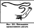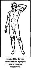 Затиснути артерію пальцями з метою зупинки кровотечі можна за будь-яких обставин. Затит екання проводиться не в рані, а вище — ближче до серця, перед накладанням джгута або пов'язки (мал. 250).