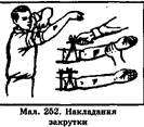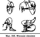 Щоб тимчасово спинити кровотечу при пораненнях кінцівок, треба максимально зігнути кінцівку і зафіксувати її в цьому положенні (мал. 253). Наприклад, якщо поранено гомілку, в підколінну ямку кладуть валик, зроблений з вати і марлі, ногу згинають у колінному суглобі і в такому положенні затягують її ременем (бинтом, рушником, косинкою). Так само при пораненні передпліччя руку згинають і фіксують у ліктьовому суглобі. На верхню частину стегна накласти джгут неможливо. Тому ватно-марлевий валик кладуть у пахову ділянку, стегно максимально притискують до живота і зак-