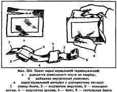 Пакет перев'язувальний індивідуальний складається з двох ватно-марлевих подушечок розміром 32 х 17,5 см, бинта розміром 10 см х 7 м (мал. 254). Одна подушечка пришита на кінці бинта, а друга вільно пересувається по ньому. Подушечки і бинт стерильні, упаковані в пергаментний папір. Зовнішній чохол пакета виготовляється з прогумованої тканини. Така подвійна упаковка перев'язувального матеріалу забезпечує надійне збереження його стерильності. У пакет вкладається шпилька. На чохлі написано правила користування пакетом. Накладаючи пов'язку, пакет беруть у ліву руку, правою рукою по лінії надрізу відкривають зовнішній чохол і виймають внутрішню упаковку. Вийнявши шпильку, знімають папір і розгортають перев'язувальний матеріал, не торкаючись руками внутрішньої поверхні подушечок, тобто тієї поверхні, що прикладатиметься до рани. Той, хто надає допомогу, може братися руками лише за прошиту кольоровими нитками поверхню подушечок. Подушечку прибинтовують, кінець бинта закріплюють шпилькою.