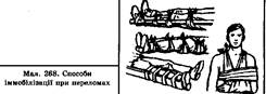 При переломі кісток передпліччя руку потрібно обережно зігнути в ліктьовому суглобі під прямим кутом, повернути долонею до грудей і в такому положенні зафіксувати шиною або підручними засобами. Шину накладають від основи пальців до верхньої третини плеча. При цьому досягається нерухомість у проме-невозап'ястковому і ліктьовому суглобах. Руку підвішують на косинці.