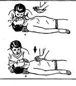 Перш ніж розпочати штучне дихання, потрібно покласти потерпілого на спину і переконатися, що його повітропроникні шляхи вільні для проходження повітря. З цією метою його голову максимально відхиляють назад. Якщо щелепи стиснуті, то треба висунути нижню щелепу вперед і, натискуючи на підборіддя, розкрити рот, потім серветкою очистити ротову порожнину від слини та блювотної маси і розпочати штучне дихання: накласти на відкритий рот потерпілого розкриту серветку (носову хустинку), затиснути йому ніс, зробити глибокий вдих, щільно притулити свої губи до губ потерпілого (для герметичності) і з силою видихнути повітря йому в рот (мал., а). Вдувати треба таку кількість повітря, щоб воно щоразу якомога повніше розправляло легені потерпілого (це можна побачити, стежачи за рухом грудної клітки). При пораненні (ушкодженні) нижньої щелепи штучне дихання можна здійснити іншим способом: вдувати повітря через ніс потерпілого (рот має бути закритим). Повітря вдувають ритмічно 16—18 разів за 1 хв до поновлення природного дихання або до встановлення цілком певних ознак смерті.