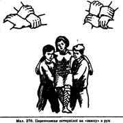 Існують такі способи перенесення на руках двома особами: на «замку», «один за одним» і з положення лежачи. При перенесенні на «замку» носії стають поруч і з'єднують руки таким чином, щоб утворилося сидіння («замок»). Якщо потрібно притримувати потерпілого, то «замок» робиться двома або трьома руками. На «замку» з чотирьох рук потерпілий сам тримається за шиї носіїв (мал. 270).