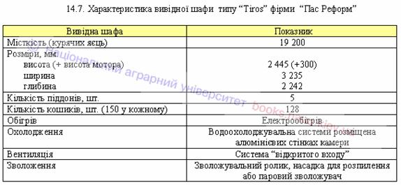 Інкубаційні машини “Dinos” — кімнатного типу. Вони розраховані переважно на експлуатацію за принципом: “порожньо-зайнято”. Однак у них можна закладати яйця і поетапно: від трьох до шести партій в одну шафу. Режим інкубації регулюється за допомогою персонального комп’ютера, яким обладнано кожну шафу. Комп’ютер автоматично регулює температуру, вологість, повітрообмін тощо. Крім того, усі машини з’єднані з центральним комп’ютером, який записує в графічному виконанні весь режим інкубації й отримані показники зберігає у пам’яті протягом місяця. На початку виводу яйця із інкубаційних лотків (за допомогою спеціальної машини) перекладають у кошики, які потім розміщують у вивідній шафі типу “Tiros” (табл. 14.7.).