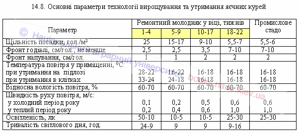 14.8. Основні параметри технології вирощування та утримання яєчних курей